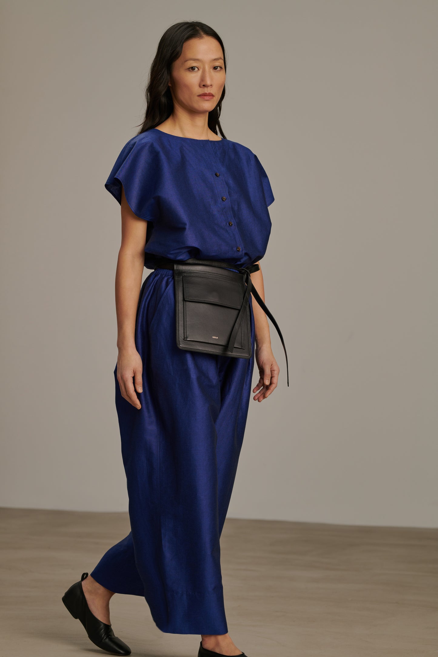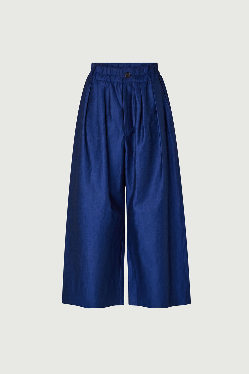 CAMERON is a wide-legged trouser with a rounded leg. Its fabric is a cotton-linen chintz, an elegant material with a slight sheen.